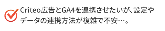 Criteo広告とGA4をスムーズに連携し、広告の効果をデータで可視化。 「どの広告が売上につながったか」「どのユーザーが反応しているか」を数値で分析し、戦略的に改善することでムダを省き、広告費を最大限に活かします。