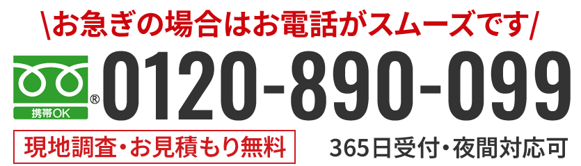 - A 365日24時間体制で受付ております。 万が一現場対応中などで電話に出れなかった場合には必ず折り返し連絡を致します。