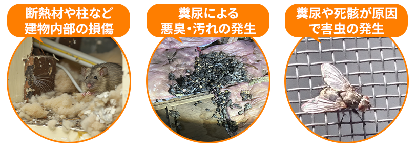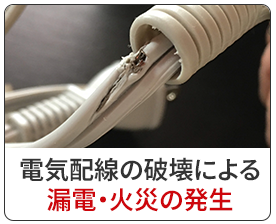 さらに、夜間の騒音被害に加え、鋭い爪で断熱材や柱を傷つけ、最悪の場合は配線が破損して火災につながる危険性もあります。