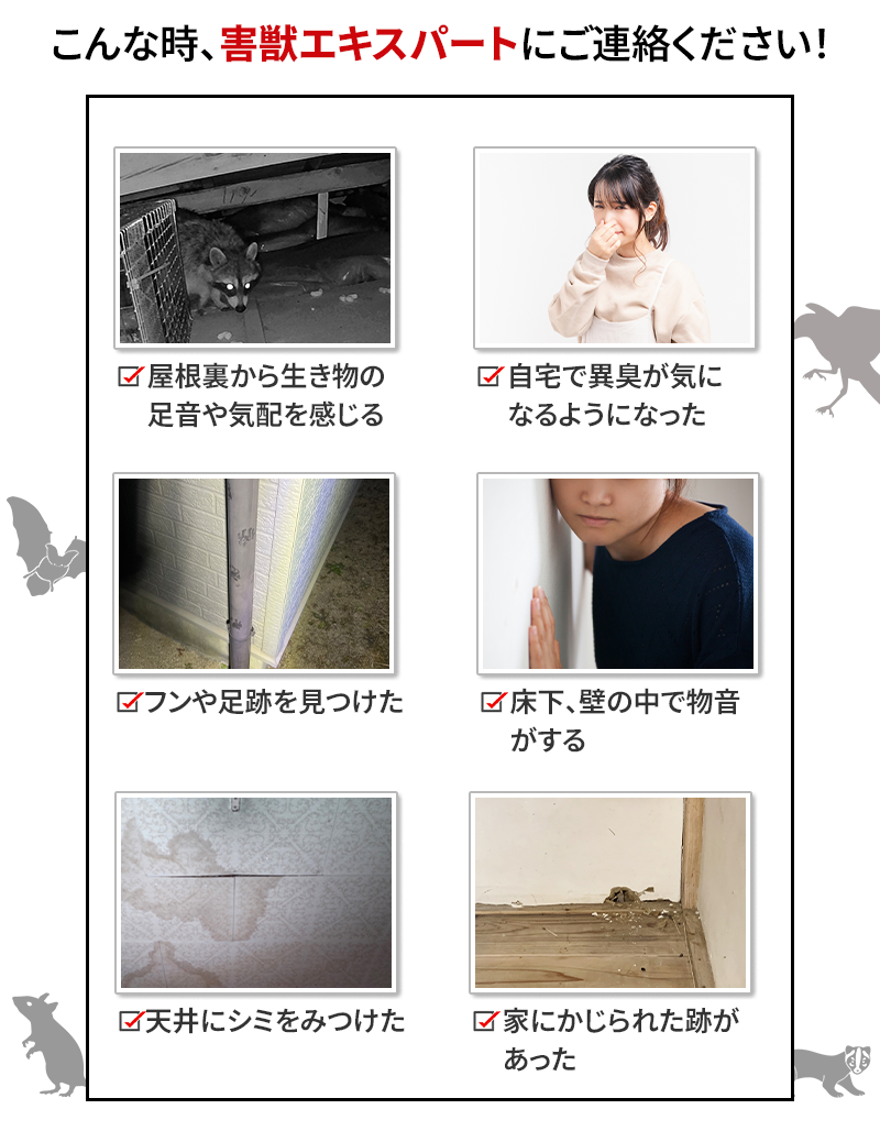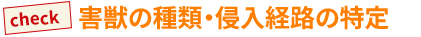 屋根裏や床下、天井などをチェックし、フンや足跡、破損の痕などから被害の有無を確認します。