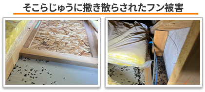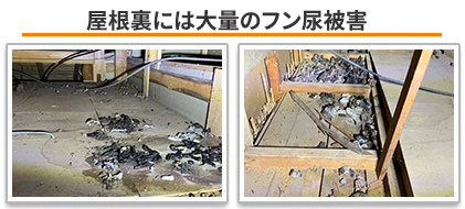 被害状況を調査してみると、屋根裏には、フンがいたるところに。