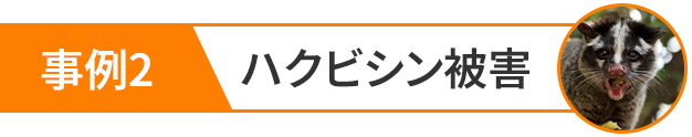 毎晩続く激しい足音に悩まされており、自分ではどうにもできず調査を依頼。調査の結果、屋根裏にハクビシンが住み着いていたことが判明し、そのまま駆除をお願いしました。