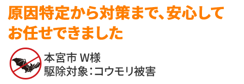 調べていただいたところ、コウモリが屋根裏に住み着いていることが判明。屋根裏の状況や侵入経路、対策まで丁寧に説明してくださり、安心して駆除をお願いできました。 依頼後はコウモリ被害はなくなり、ストレスなく過ごせてます。ありがとうございました。