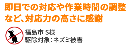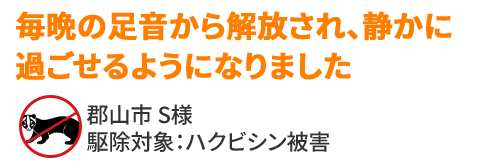 駆除後は足音も完全になくなり静かに過ごせています。ありがとうございました。
